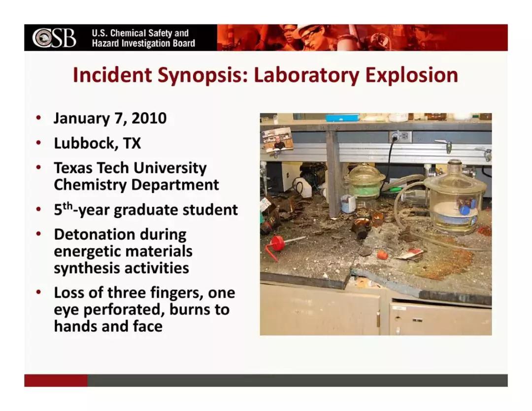 2010年,美國德州理工大學(xué)(TTU)的一個研究生在做化學(xué)合成時,遭遇爆炸事故,為此失去了左手的三根手指。2015年12月18日,清華大學(xué)化學(xué)系何添樓二層一間實驗室發(fā)生爆炸火災(zāi)事故,一名正在做實驗的博士后當(dāng)場死亡;北京安監(jiān)局通報稱,事發(fā)時他正在用氫氣做實驗。