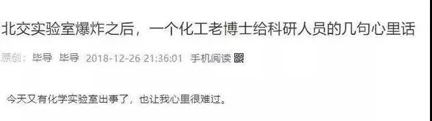 北交實驗室爆炸事件發(fā)生后,清華博士生“畢導(dǎo)”也在其微信公眾號發(fā)布文章,對此表示難過,同時,也在安全方面提出了經(jīng)驗之談。