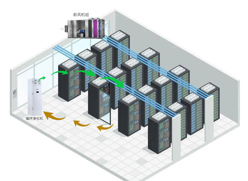 在數據中心機房安裝內循環凈化機組(DFQ360),機組加載化學過濾模塊,對數據中心機房內部空氣進行持續循環凈化,去除積聚在機房內的氣態污染物;