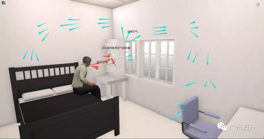 在房門常閉的隔離房間內,在床頭或病人側靠窗戶的一側安裝一臺1000m3/h立式高效醫用型空氣消殺器,吸風口對準疑似病人,出風口對窗,窗戶開一條縫換氣(開度靈活控制)。立式高效醫用型空氣消殺器的特點是:設備內安裝紫外線殺菌燈和H13的高效過濾器,起到殺菌消毒及直徑0.3微米粒子99.97%過濾作用;凈化風量大,可快速過濾污染空氣;噪音小,可多檔位調節,在房間內使用不太影響人的情緒;電源為220V插座式,即插即用。疑似病人呼吸出來的污染氣體被立式高效醫用型空氣消殺器吸入后經過紫外線殺菌燈后再經過H13的高效過濾器過濾,經過殺菌過濾的空氣病毒濃度低于安全標準,通過窗縫部分排到室外,大大減輕了室內污染濃度,同時隔離間形成相對的微負壓,起到很好的隔離效果。疑似病人呼吸出來的污染氣體雖經立式高效醫用型空氣消殺器處理,但還會有少部分病毒彌漫在隔離室間內,會污染房間內的家具、被子、衣服等物品,所以需每日定時對隔離房間用臭氧發生器或噴霧消毒液進行消殺處理。