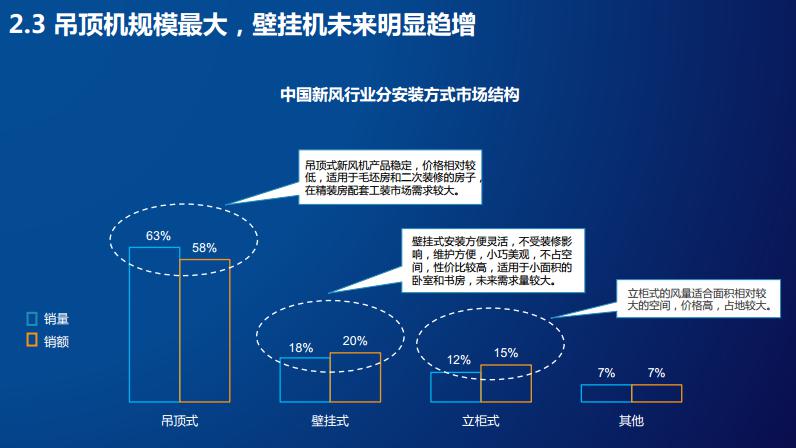 從安裝方式結(jié)構(gòu)看來(lái),吊頂式新風(fēng)機(jī)產(chǎn)品穩(wěn)定,價(jià)格相對(duì)較低,適用于毛坯房和二次裝修的房子,在精裝修房配套工裝市場(chǎng)需求較大;壁掛式和立柜式安裝方便靈活,不受裝修影響,維護(hù)方便,未來(lái)需求量較大,總體而言,吊頂機(jī)規(guī)模最大,壁掛機(jī)未來(lái)明顯趨增。